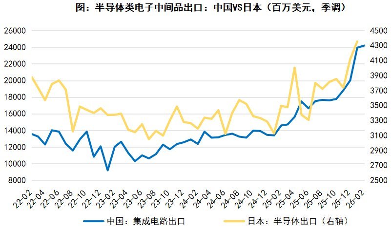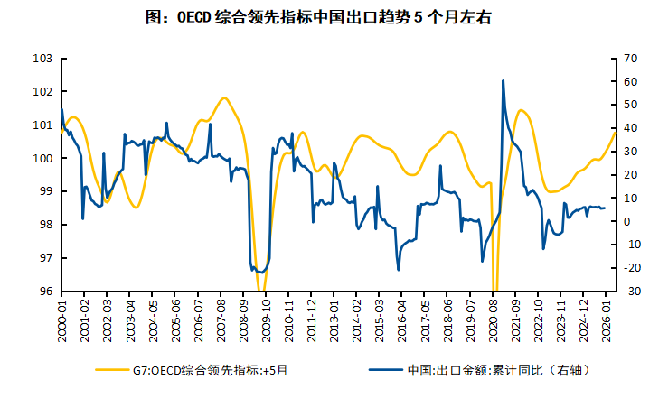 未来中国出口的强趋势能否延续?从下方图表来看,G7-OECD 综合领先指标(黄线) 对中国出口金额累计同比(蓝线)具有明确的前瞻性指引,其拐点通常领先中国出口约 5-6 个月,目前该指标已处于震荡上行通道,这意味着未来数月中国出口增速将延续温和上行态势。叠加 2026 年 1-2 月出口以美元计价同比大增 21.8% 的强势开局,以及全球制造业 PMI 连续 7 个月扩张带来的外需边际改善,再加上我国在集成电路、汽车等高技术产品出口上的高增动能与出口市场多元化的持续推进,多重因素共同支撑未来中国出口仍将维持高增与强韧性。